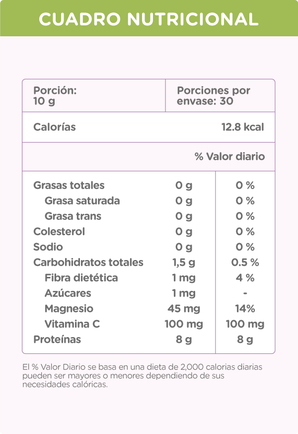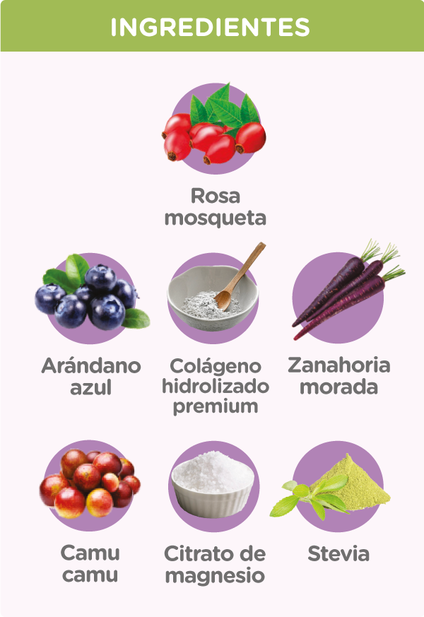 Rosa Mosqueta, Colágeno Hidrolizado Premium, Arándano Azul, Zanahoria Morada, Camu Camu y Magnesio. |